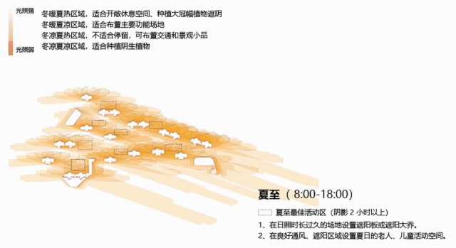 分析园区气候 分析园区气候尤其风向和日照,根据环境小气候选择最佳场地布局活动,同时寻找出“气候死角”,规避该区域布置人群聚集场地。