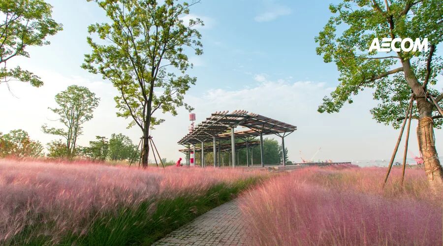 作为这片粉色田野所在地滨江风光带的景观设计执笔者,AECOM不仅勾勒出岛上美丽景致,进一步拉进了人与自然间的距离,更从绿色基础设施的角度出发,通过贯通风景秀丽的慢行连续流线、保留场地遗迹、循环利用在地材料、选用本土植物等策略,恢复了大片野生动物的栖息地、减轻了岛屿防洪基础设施的景观和视觉影响,在减少岛屿碳足迹的同时提高城市韧性。
