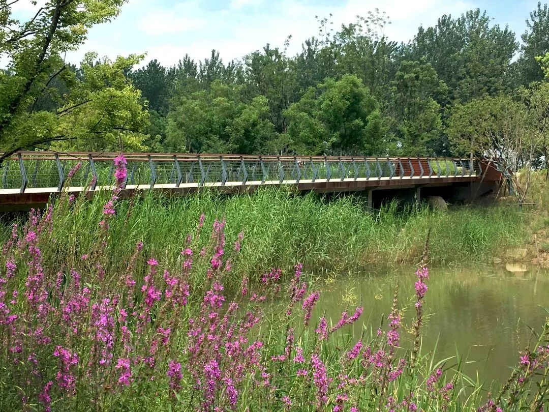经过居住区附近的入口进入公园,迎面而来的便是一座连接着入口广场与雨水花园的景观桥,从此处可以俯瞰收集场地近半数雨水的滞留池。滞留池以及雨水花园很好地体现了海绵城市的设计理念,极具生态教育意义。桥的两端设有耐候钢板景墙,上面刻有流线型的岛屿图案,景桥与堤顶路相连,驻足于此,可眺望堤外现有的茂密杨树和柳树林。