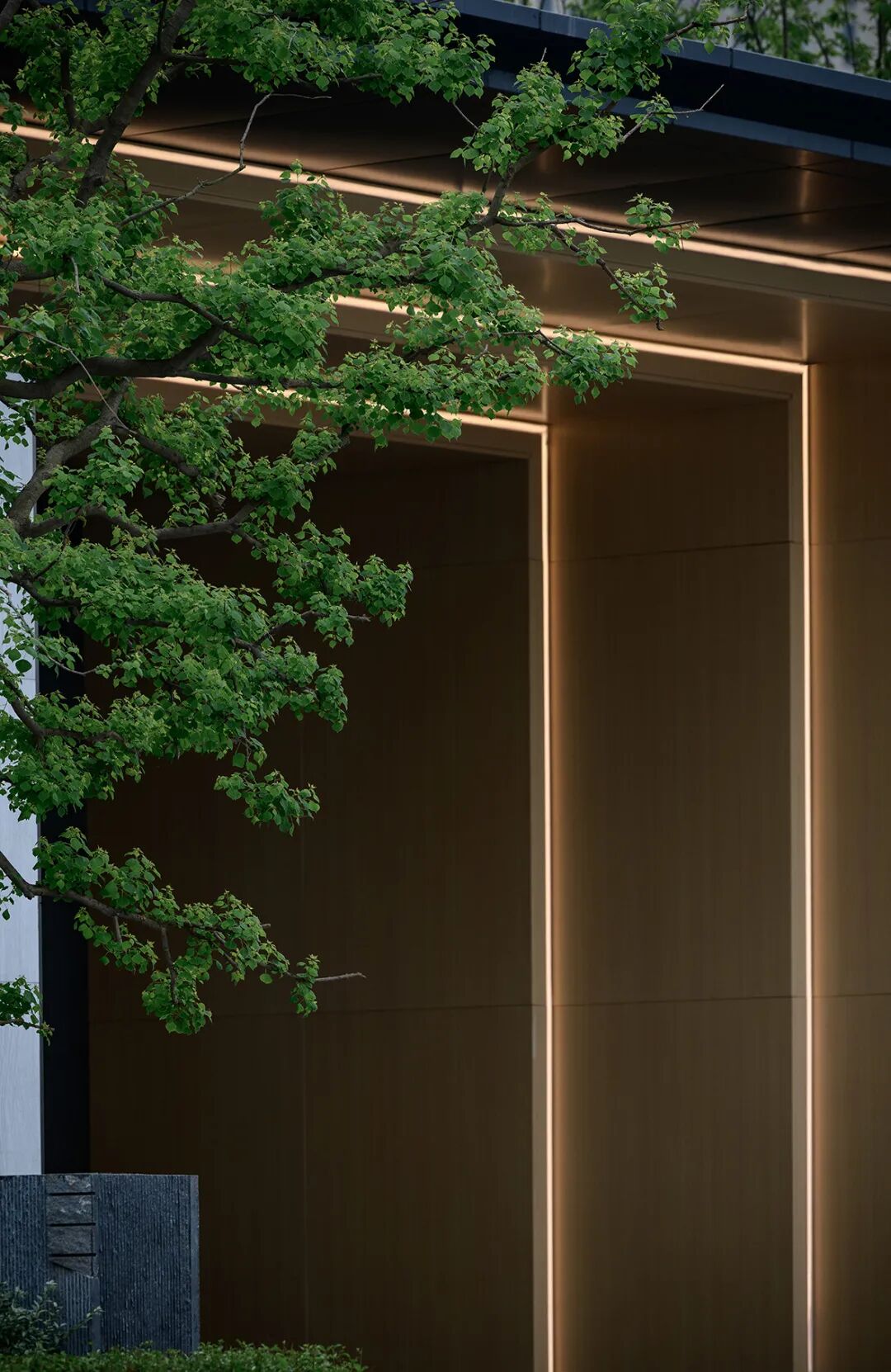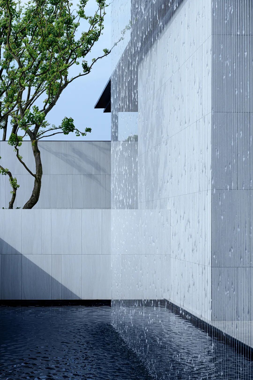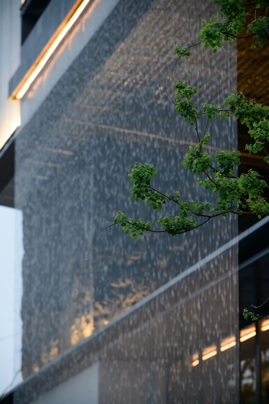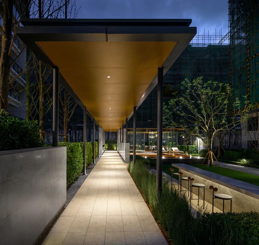 5米挑高,59米横向延展的大尺度酒店式归家大堂让归家成为秩序体验。景观与建筑融合——展示界面水幕,滴水汇聚成帘,隔绝外界喧嚣,让归家即享受一份宁静。