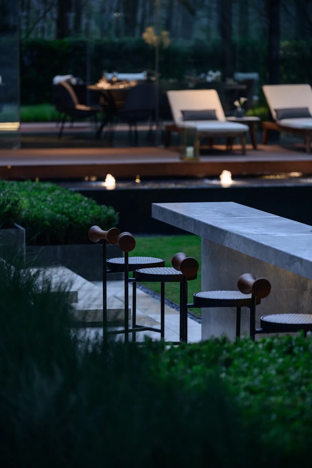 会客厅是风景里的生活社交场,下沉卡座隐于树木灌丛之中,营造半私密、亲和安静的会客空间,风雨连廊延伸至Q会客厅,串联自然与生活。夏日午后,鸟鸣啾啾、花木在侧,可与好友在此洽谈,享受山林的低密时光。
