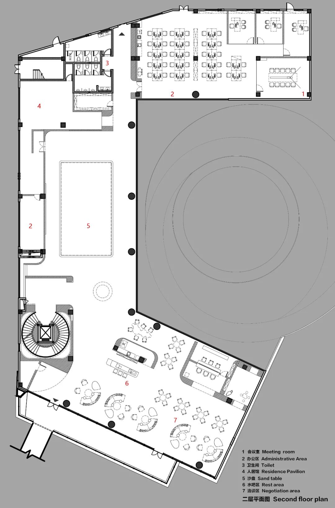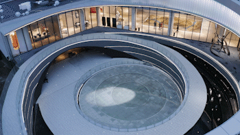 中心环道随着视角转变而发生变化,材质以及自然光洒下的光影带来的不同的视觉效果。光即是阴影,它的多源头可能性,它的透明、半透明与不透明性,它的反射与折射性,会交织地定义与重新定义空间。