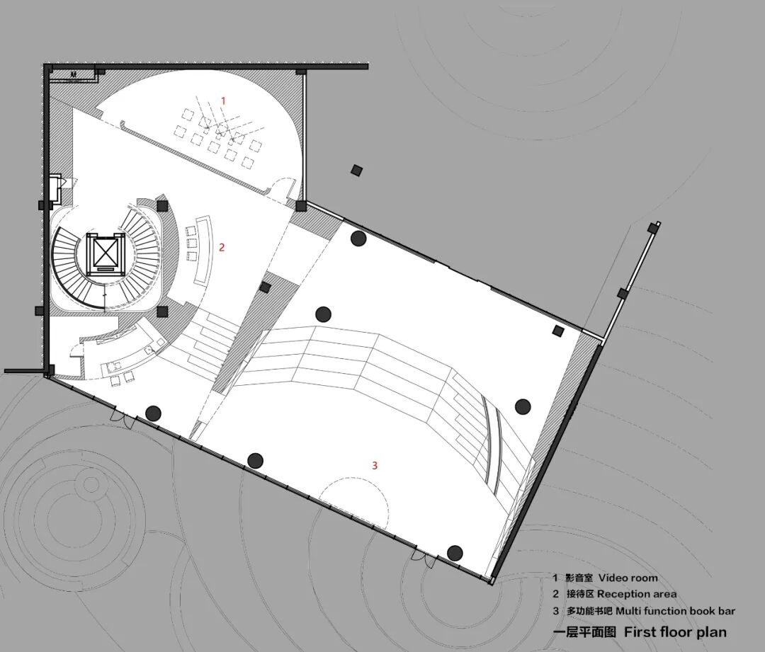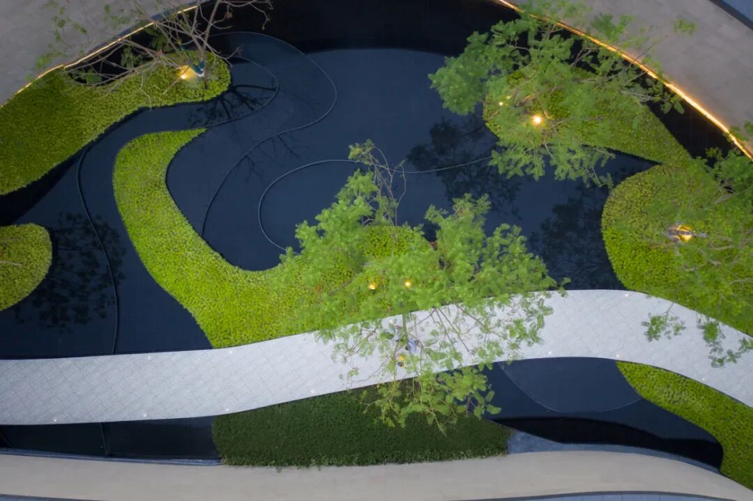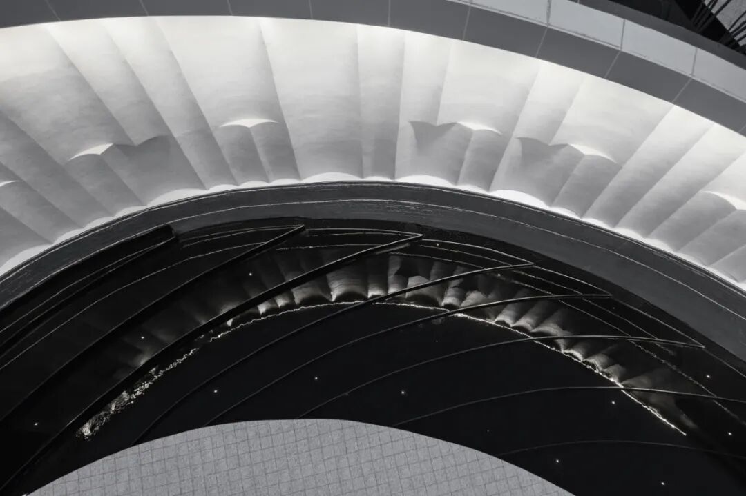 建筑师面对场所,从单纯的“流动”概念出发,发展出建筑的各个基本元素:形体、空间、墙面、照明。中心景观呼应"天圆地方"哲学观,随着空间动线的视觉引导,在下沉空间的创造性转变中,山水演化的黄金螺旋,划分多层次立体交融空间,去除规整的直线,营造空间的沉浸式互动体验,建构“可观、可游、可赏”的丰富空间体验。