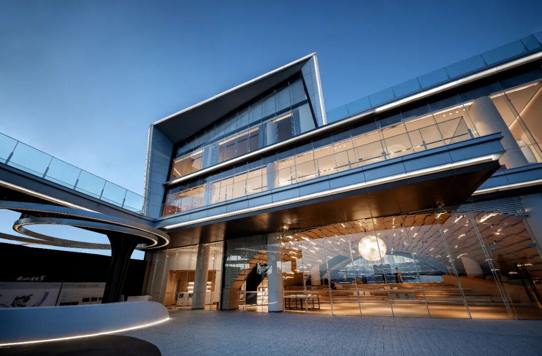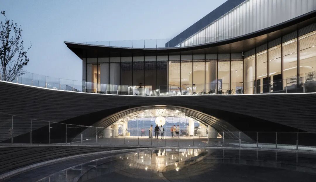 在有限的场地中如何将空间体验放大,设计将建筑景观室内的边界进行弱化,建筑的幕墙和景观围合有机融合,通过拱的语言将室外中心坡道与室内书吧串联,打造“星空之眼”,同时将观者视线继续向外延伸,再次与外部的天地、山水、自然进行连结,统一打造一体化的空间情绪递进。