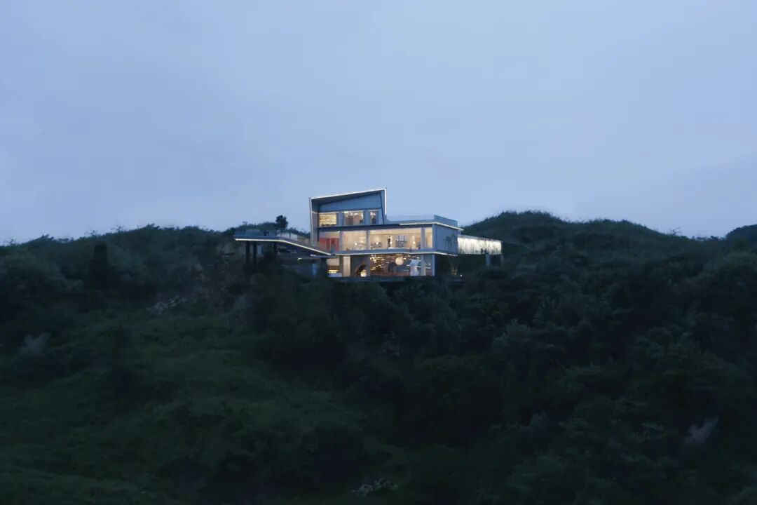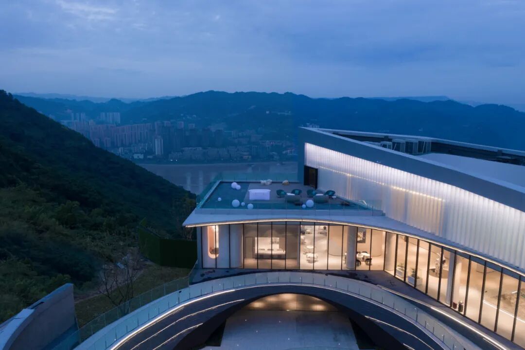 春风印月·星空小镇位于重庆涪陵北山之巅,场地远眺长江乌江,直接感受磅礴的江景气势。项目初始即定位为建筑、景观、室内一体化打造的目标,融合“山、水、天地、自然”几大要素,去边界化,回归场所本质,让空间和自然互为补充,唤起大家对环境的尊重,创造一个人与自然共情的体验场所。从艺术化重构自然的角度出发,根据场地的区位、高差、地势,组织变换场所的起承、收放、围合,使整体流线张弛有度,跌宕起伏,丰富使用者的参观体验感。