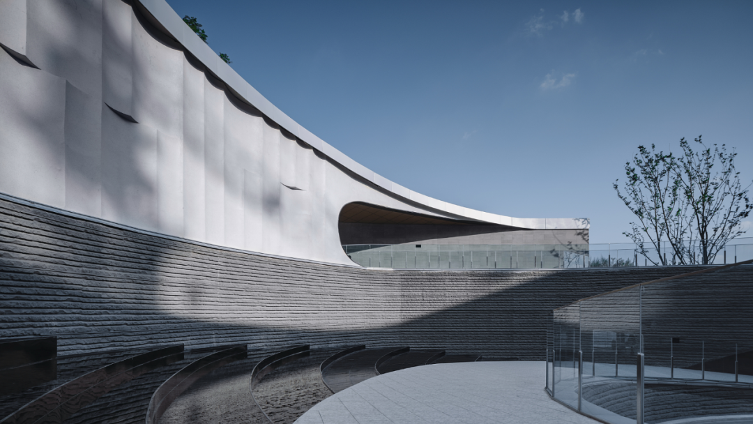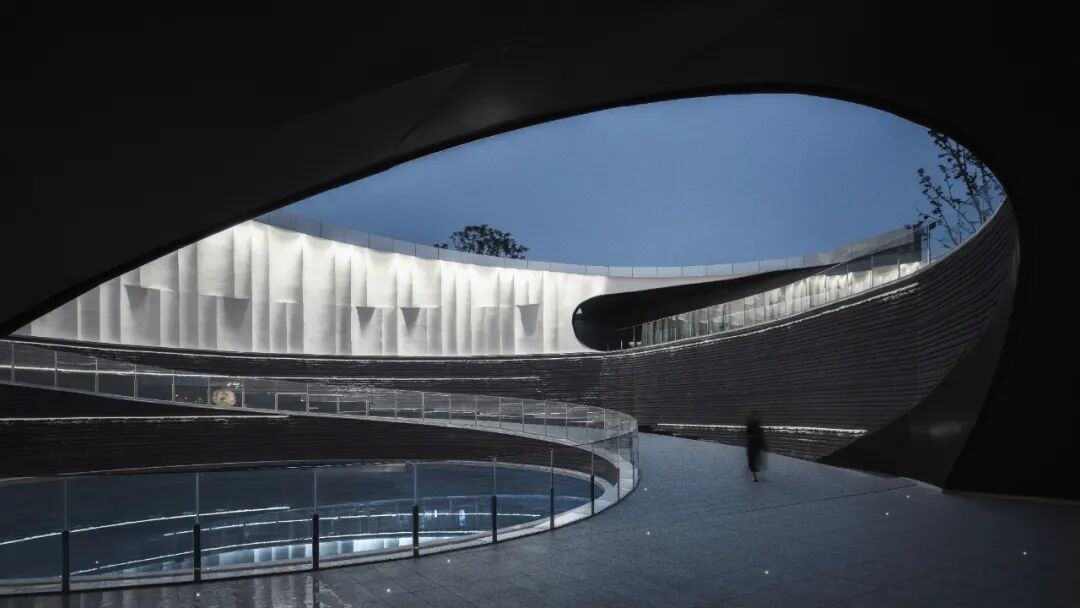 建筑整体造型融入周围环境,同时又将设计痕迹恰当的融入。以中国传统山水文化与美丽的自然万象为基础,抽象山、水、星空元素,传递高远、浩瀚、璀璨的场所气质,融通文脉,贯穿古今,让场域活性化并带给空间丰富的文化深度。前场景观通过抽象的水波纹理,让观者感受静谧流动的水文化。中心环道用现代的材料和抽象的手法,层层叠叠的台地景观紧扣重庆自然山地地貌。