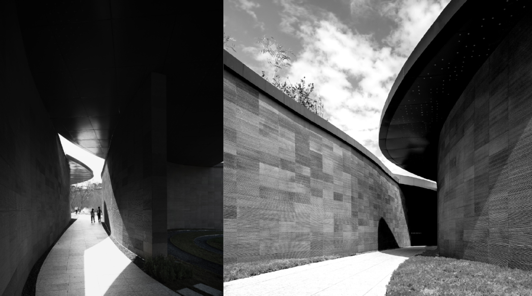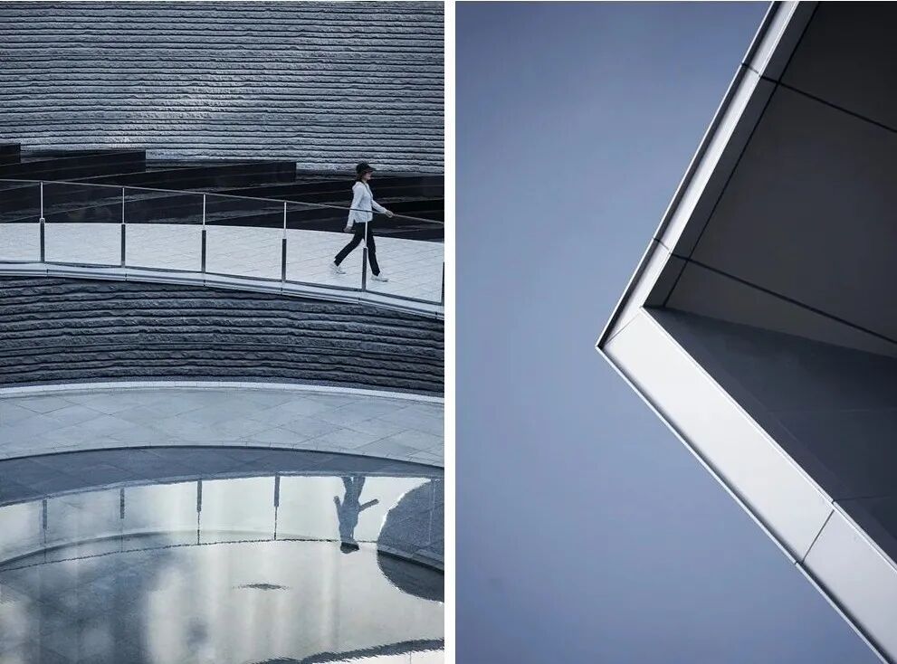 不同的材料选型在场景里传递着不同的情绪体验,石材的师法自然、混泥土的流动冥想、玻璃的朦胧静谧、金属的刚毅坚韧,木材的婉约温润。在阴天居多的重庆,选择能够创造更多光影变化的材质,比如折形U玻幕墙,保留U玻温婉细腻的气质同时强化层次与质感;抽象水波纹的GRC幕墙同样强化了灵动的山水韵味。