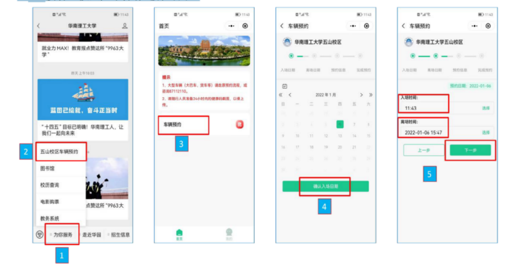 ①在公众号左下角选择“为你服务”-“五山校区车辆预约”。