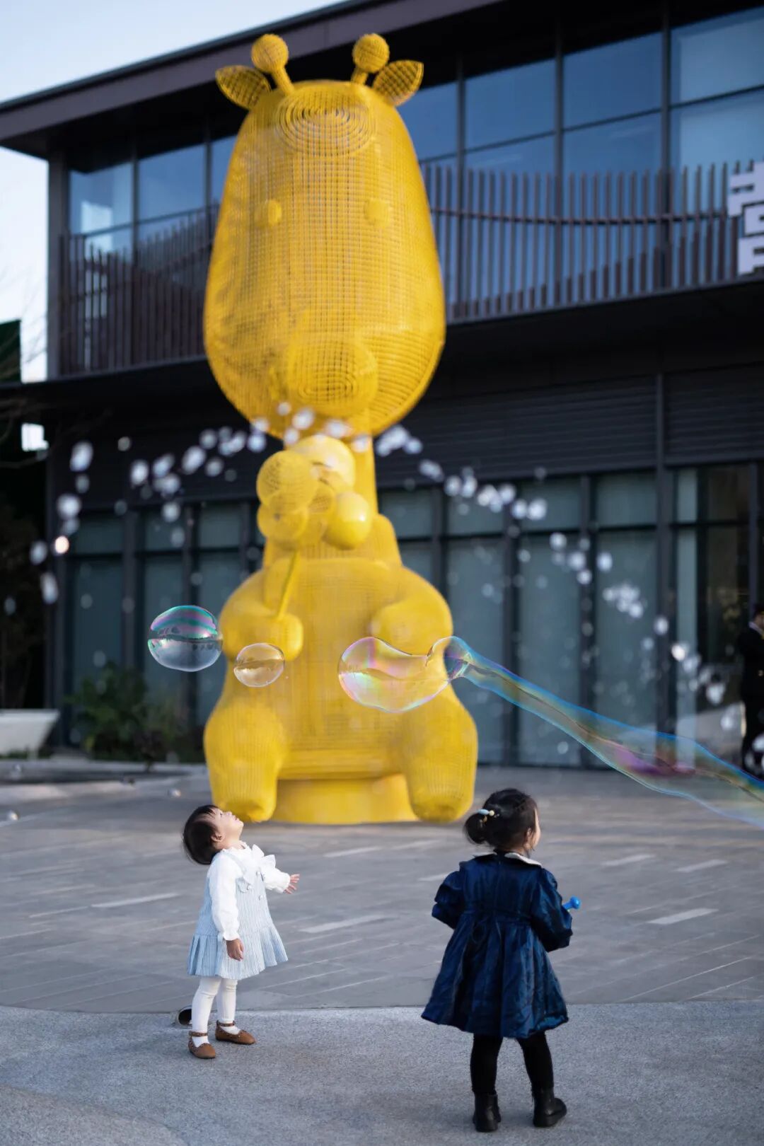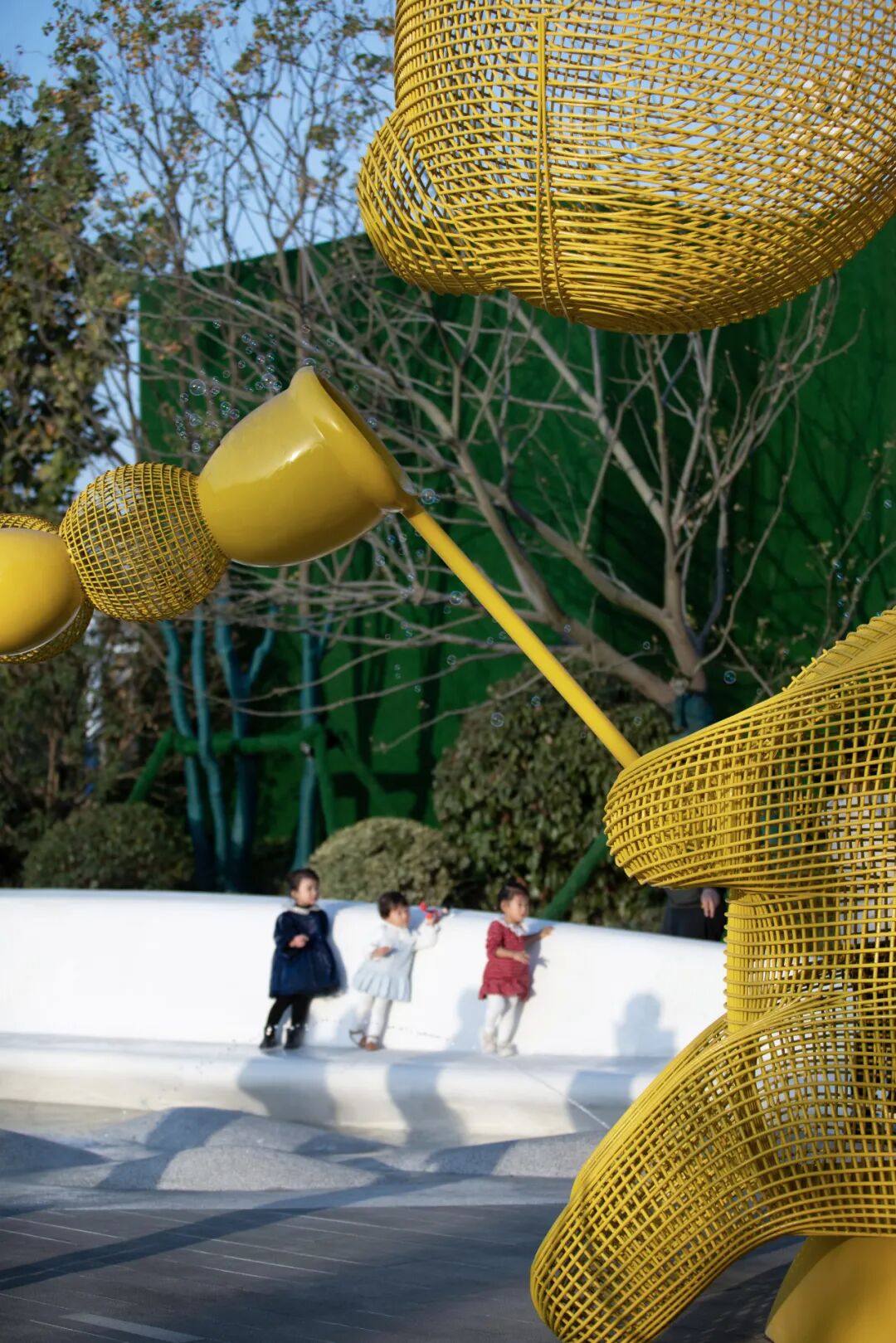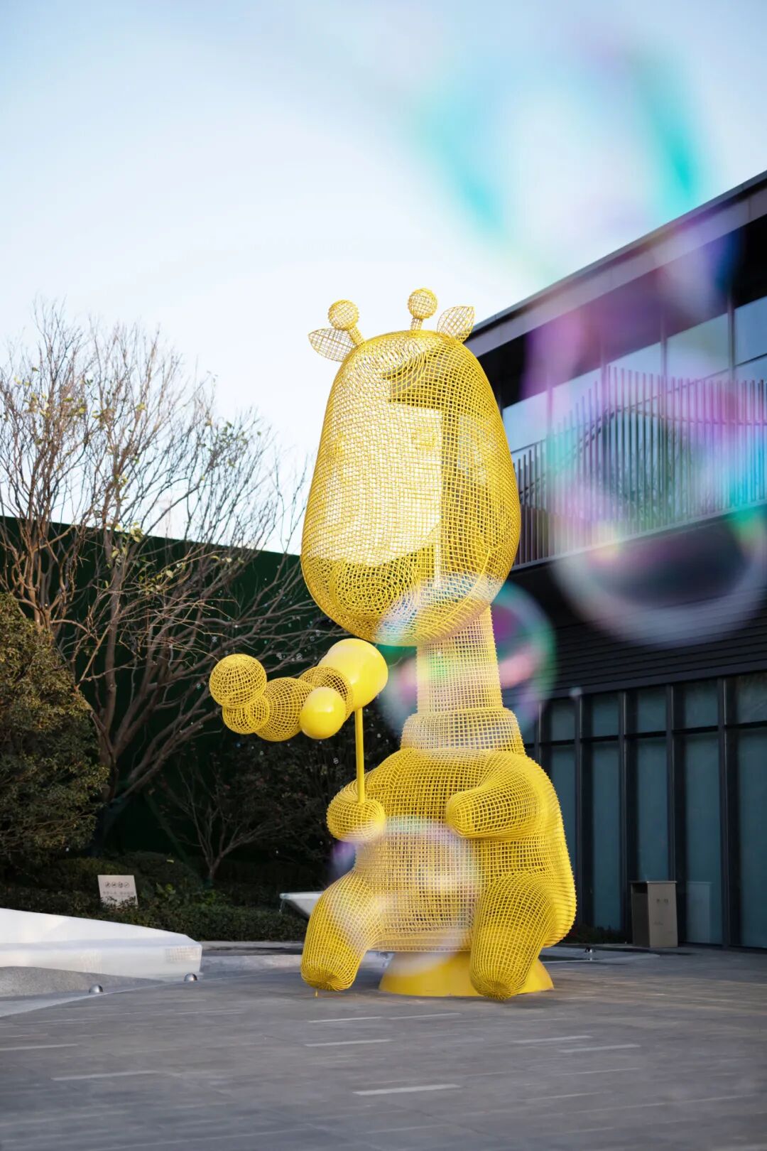 小萌的形制得意于兴港和昌的IP形象“和小萌”,设计师在这里量身定制,圆乎乎的明黄色小萌(以316工业金属不锈钢3D数据编织工艺制作而成),坐在“洲岛”之畔,泡泡魔法棒(暗藏泡泡机每隔15分钟便能吹出泡泡)吹出欢乐五彩的幸福泡泡——在此地点亮一个有畅想力的互动场景。