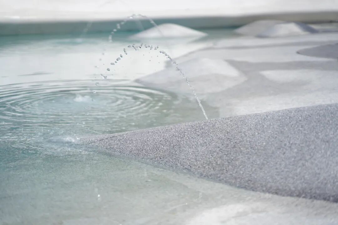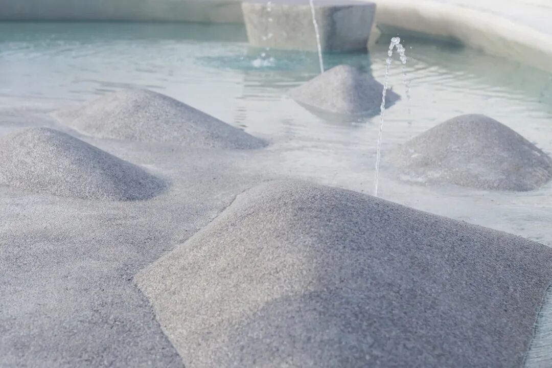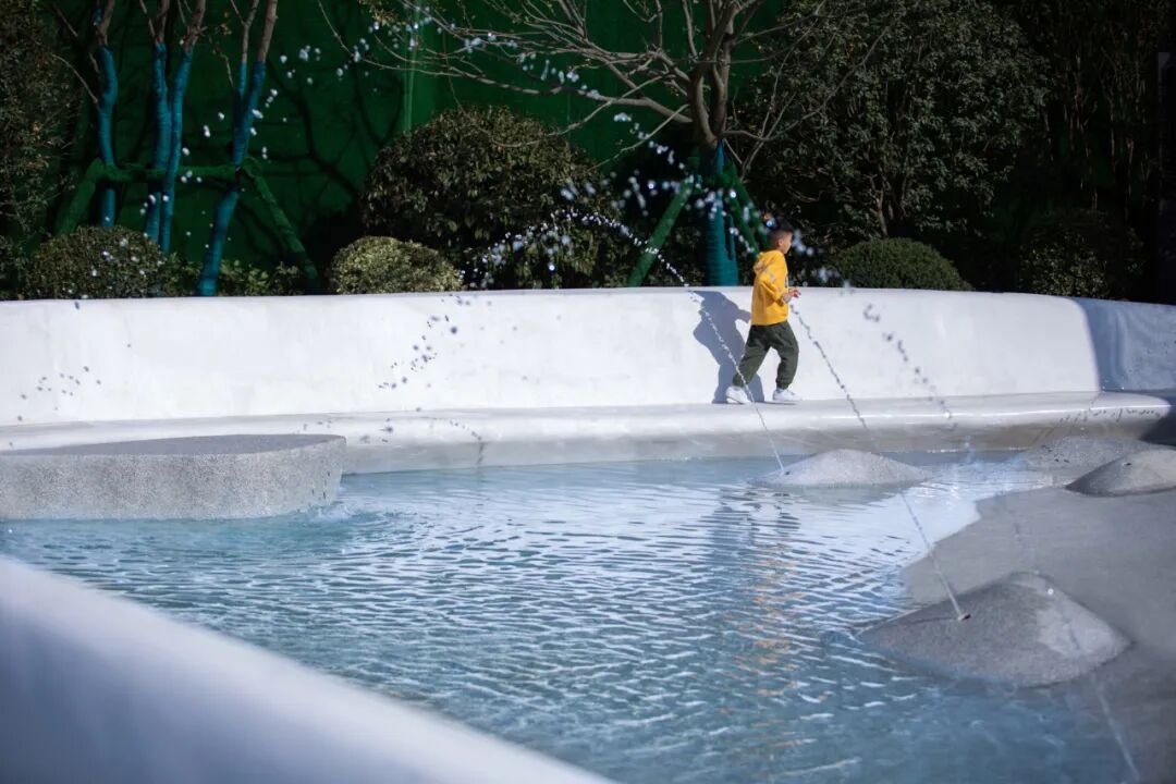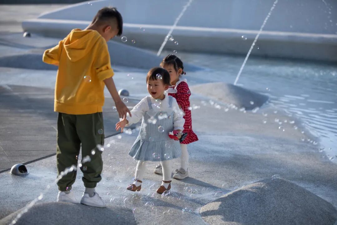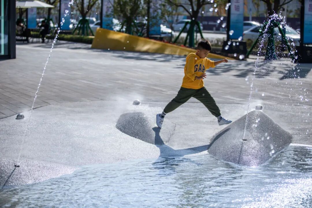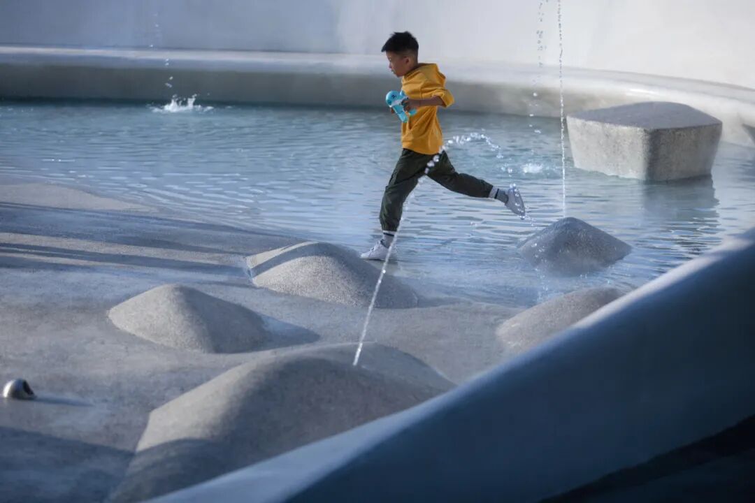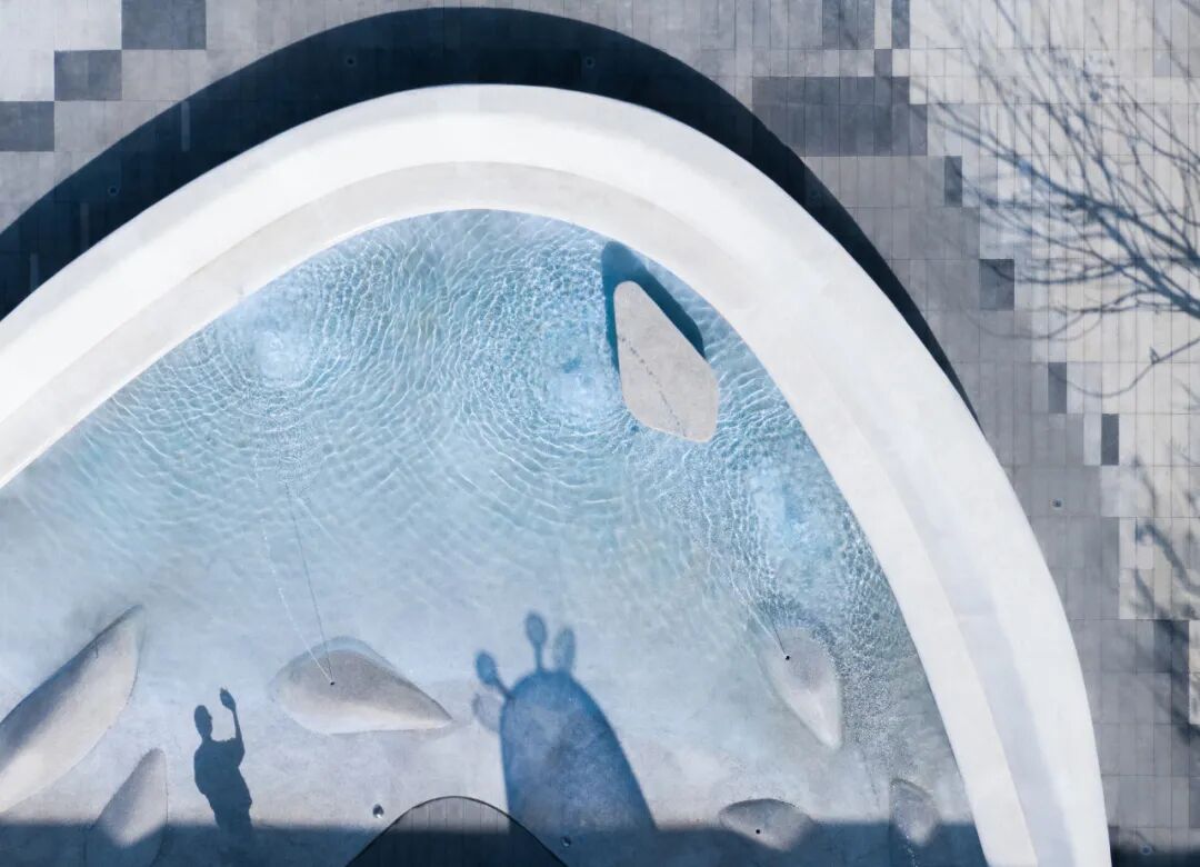 步行至街角,呈现的是一个超萌的”和小萌“大型织网雕塑,高度控制在5.9米的高度,是对城市视线的呼应,也是对广场尺度的考量。雕塑上泡泡魔法棒中每隔十五分钟喷出的泡泡,会随机落在一个洲岛浅滩式的戏水池中。洲岛浅滩既是对洲岛观概念的映衬,也是为城市空间提供的一处开放空间场所。这一场所被一道优美的弧形坐凳囊括在内,既是水池的边界又具有空间收敛的效果。
