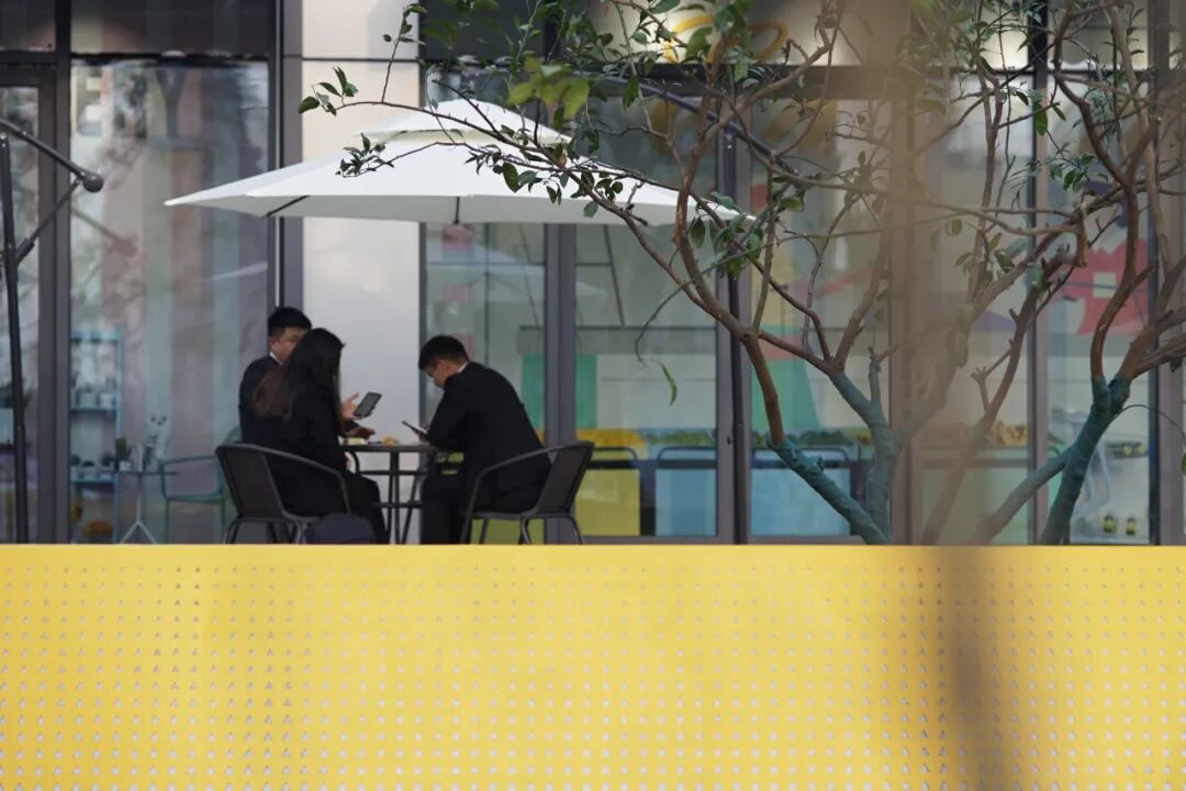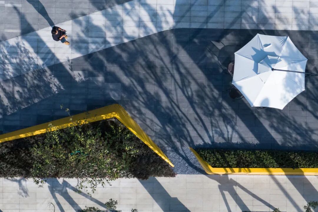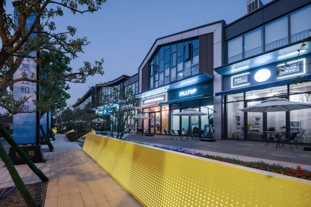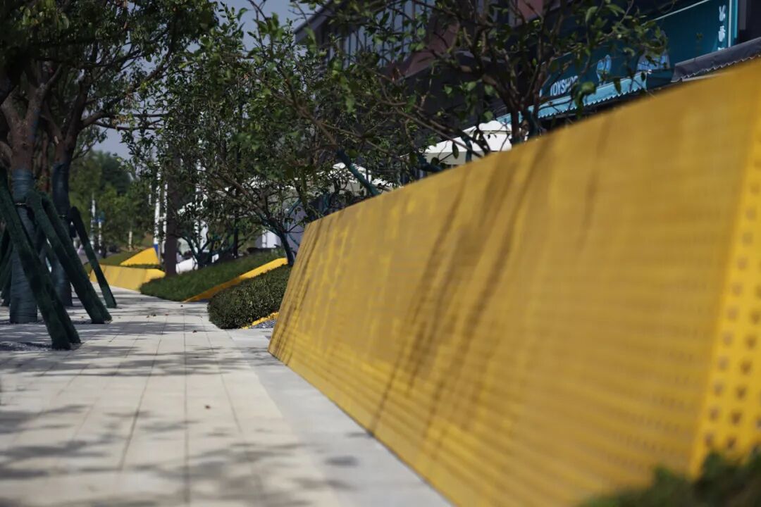 停车后进入的第一幕空间,“和小萌黄”穿孔板包装下的连续的城市界面,既是样板区期间的商业氛围展示空间,与室内儿童活动呼应的户外活动空间、也是未来的停车空间。在特意种植的行道树的映衬下,明快的黄色与商业店招的色彩相映成趣。