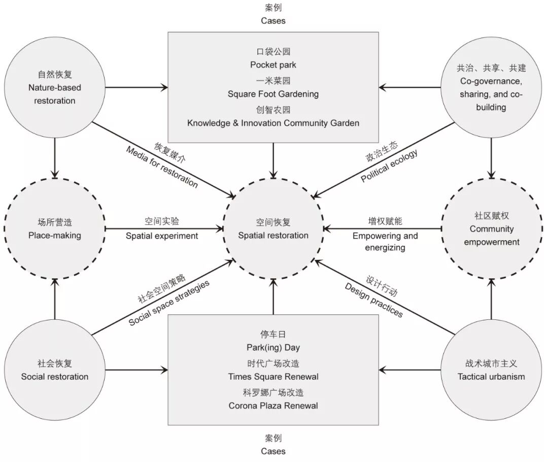 空间恢复理论框架。该框架具有较强的跨学科背景,涉及恢复媒介、政治生态、社会空间策略和设计行动等内容。© 徐磊青,言语