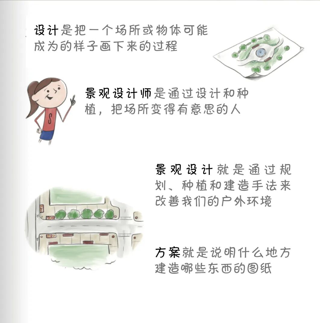 作者香农∙盖普(Shannon Gapp)借助小女孩萨曼萨的童真视角,回答了“景观设计是什么?”“景观设计师是做什么的?”等问题,并解释了“设计”“图纸”“雨水花园”等专业名词。ASLA答的卷子,设计师家长们还不快来抄作业!