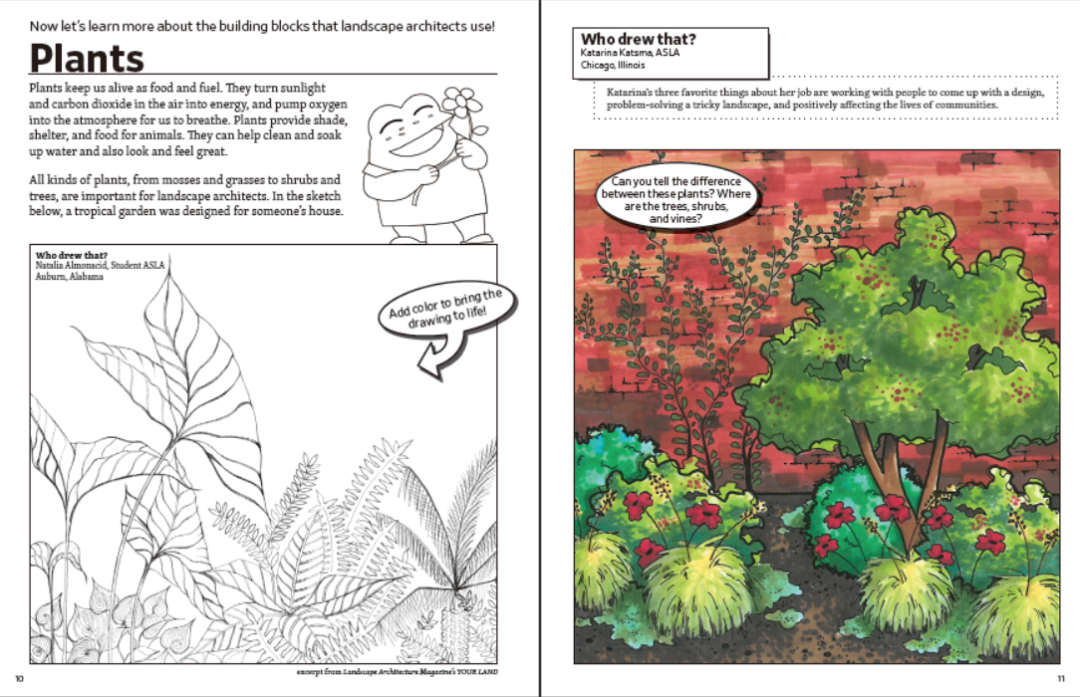 2018年,ASLA又推出了针对9~12岁学生的职业教育启蒙绘本:《探索景观设计——儿童活动手册》(ASLA Discover Landscape Architecture — Activity Book for Kids),向儿童读者展示了景观设计师的工作日常。