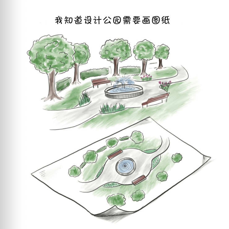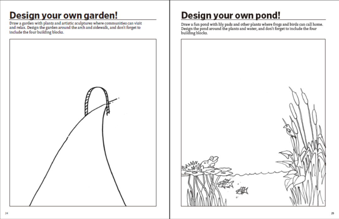 除了教孩子们认识植物、土壤、水体和建筑材料等设计要素外,绘本还预留了空白页,可供小读者自己动手设计公园、游乐场、城市广场、社区花园、小水塘!设计师家长可以过把甲方瘾:“小X啊,你这方案改改,再改改。”