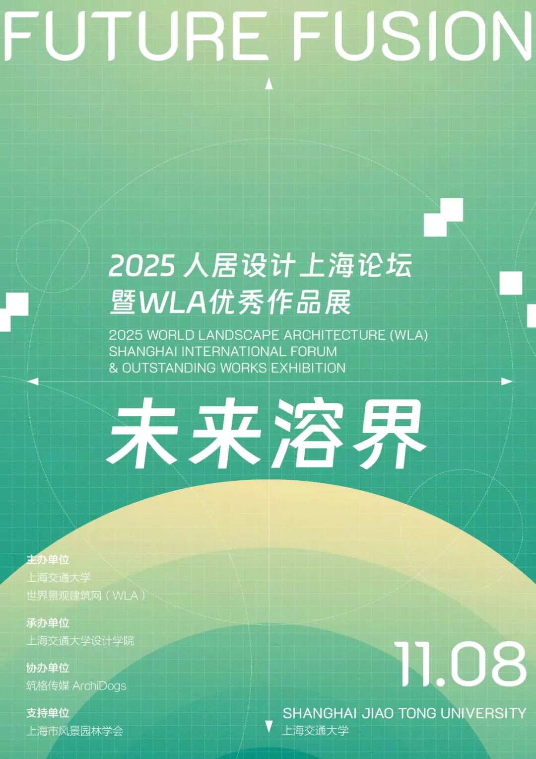 2025年人居设计上海论坛(WLA Shanghai International Forum)由上海交通大学设计学院承办,这将是世界景观建筑网(WLA)首次联合高校线下举办国际论坛、优秀获奖作品展览、及学生竞赛颁奖典礼。本次论坛主题为“未来溶界Future Fusion”,致力于推动面向未来的人居设计理论与实践的深度融合与跨界创新。论坛将同时举办WLA优秀作品展览与2025年WLA学生竞赛颁奖典礼。