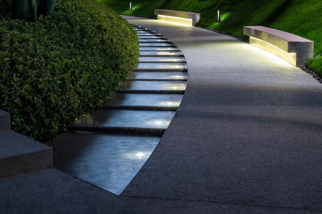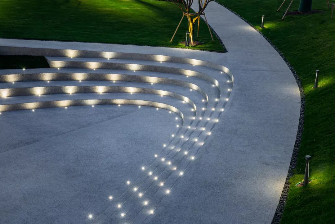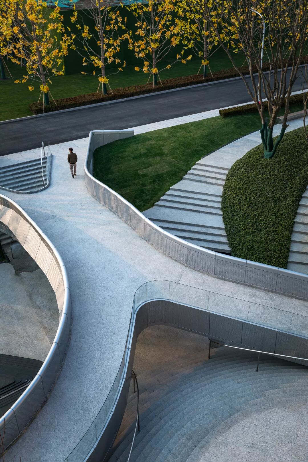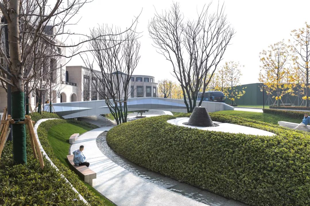 一座飞桥跨越场地,直抵商业中心,俩侧下沉空间各有不同。一侧是蜿蜒的步道伴着小溪,随着地形的起伏变化,引导人们在场地上穿梭漫步。另一侧步道盘旋而下形成广场和户外坐阶。无论是材质的选择还是种植的塑造,都在强调空间整体的流畅感。