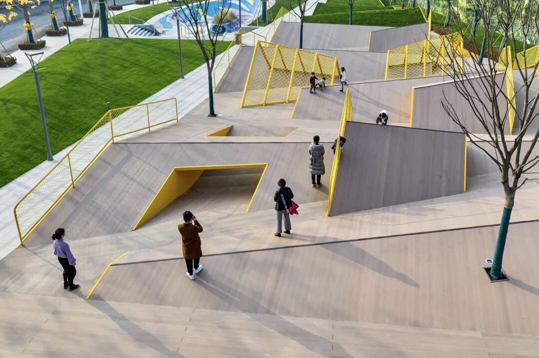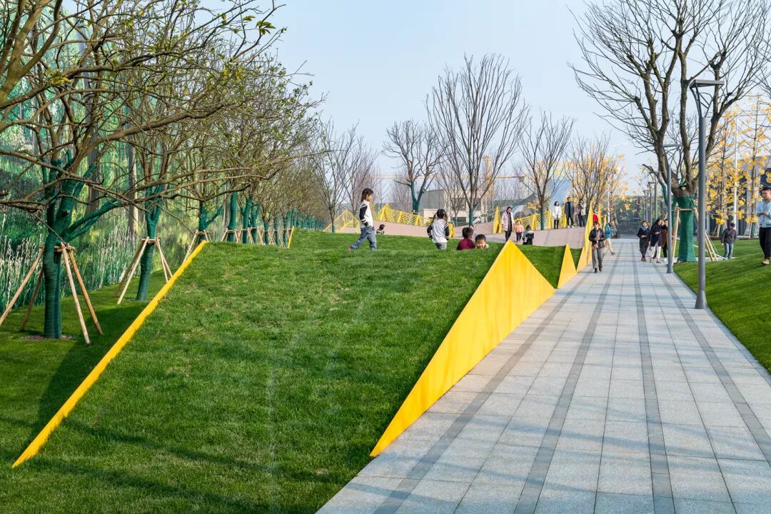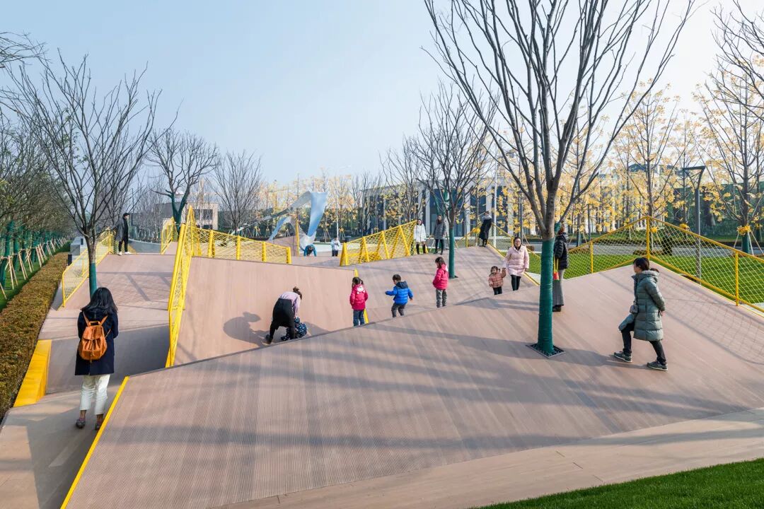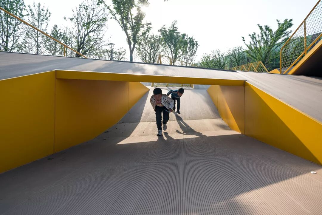在北区折叠公园的设计中,我们刻意减少儿童器械的使用。希望通过折纸般的地形鼓励儿童手脚并用,以身体感知大地。孩子们可以奔跑攀爬,可以躲猫比赛,自由自在地决定怎么玩。