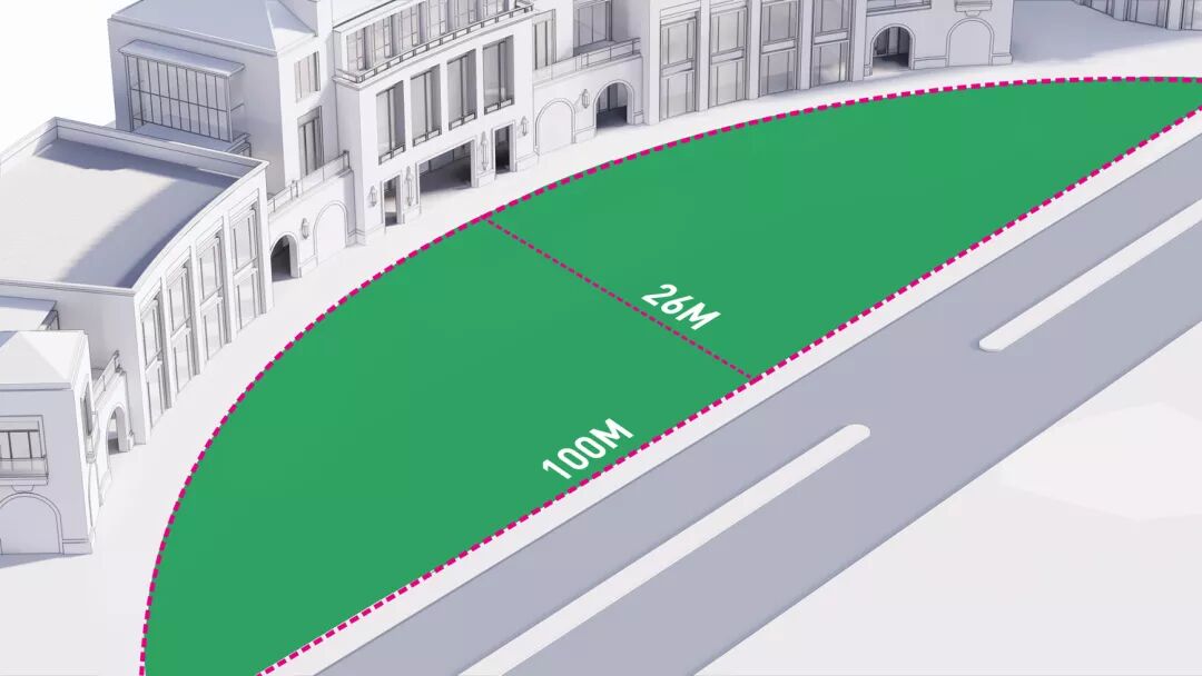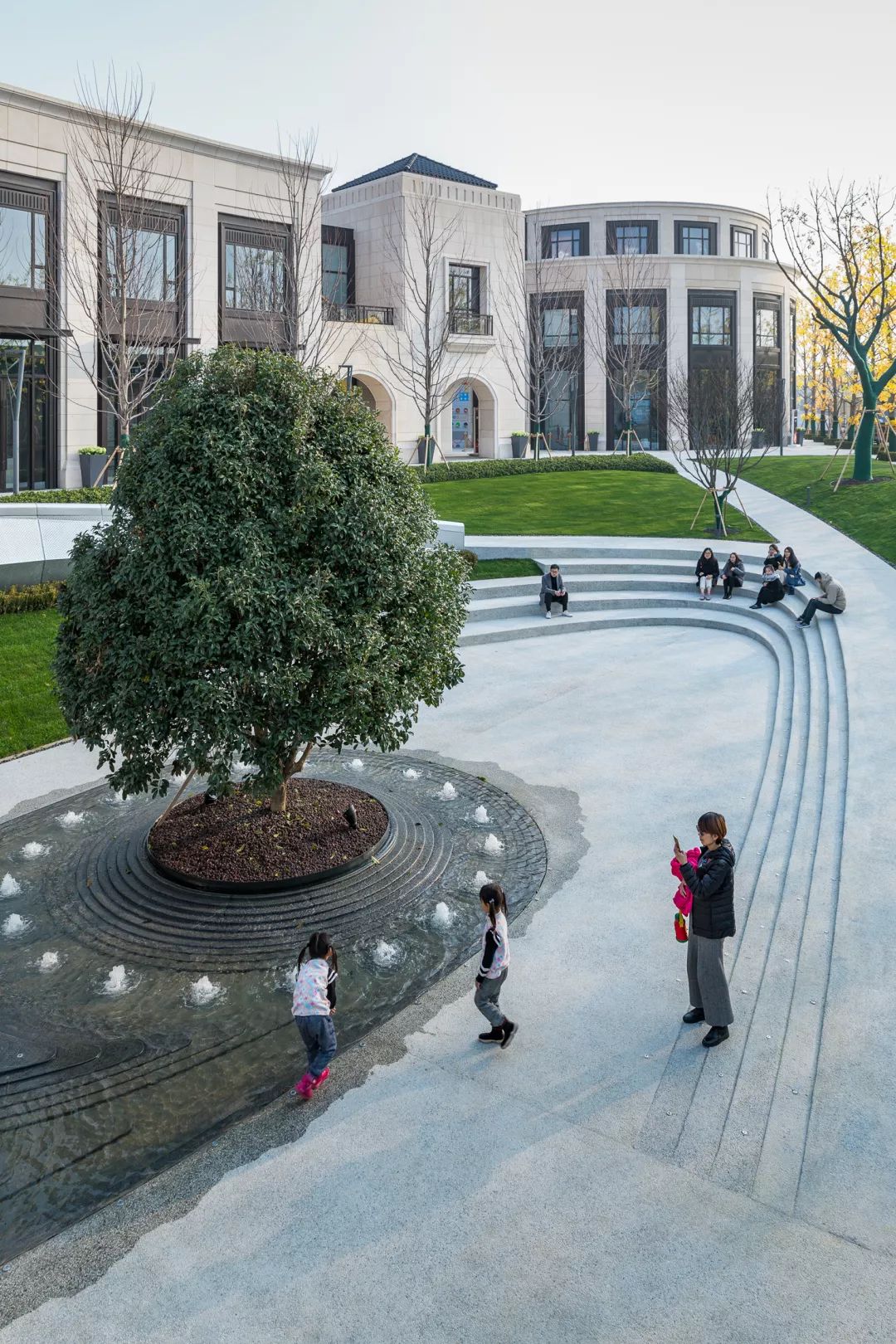 作为未来社区中心的商业建筑,以东西向为轴线,向南北两翼展开,两翼100多米,中轴距离社区道路不到30米,形成强烈的古典对称格局。对于这个狭长的建筑前广场,我们希望景观在空间尺度上与建筑是平衡的,但它不应该只是一个附庸建筑形式的景观空间。商业立面的展示要求与狭长地块的尺度限制反而激发了我们去探索如何用纯粹的“空间”来呈现空间,空间在这里回归到它的本质:尺度,高差,动线以及氛围质感,“行为”自然而然地呈现在人与环境的互动中。