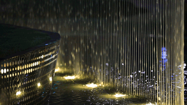 口水帘从景墙潺潺而流,借用景观框景的手法,景墙与水滴雕塑交相辉映,形成一幅悠扬的画卷。