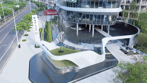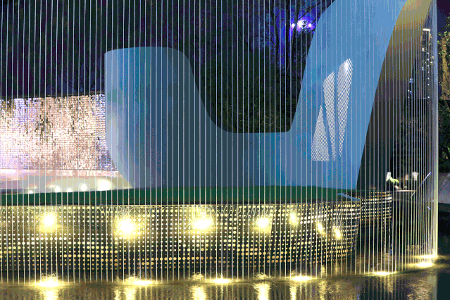 设计重点打造了风动景墙互动装置,景墙与场地开阔水景互动而立,相映成辉,俨然一幅“天光云影共徘徊”的自然风光画面。