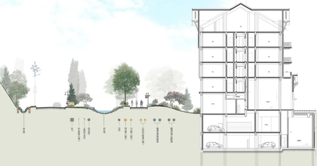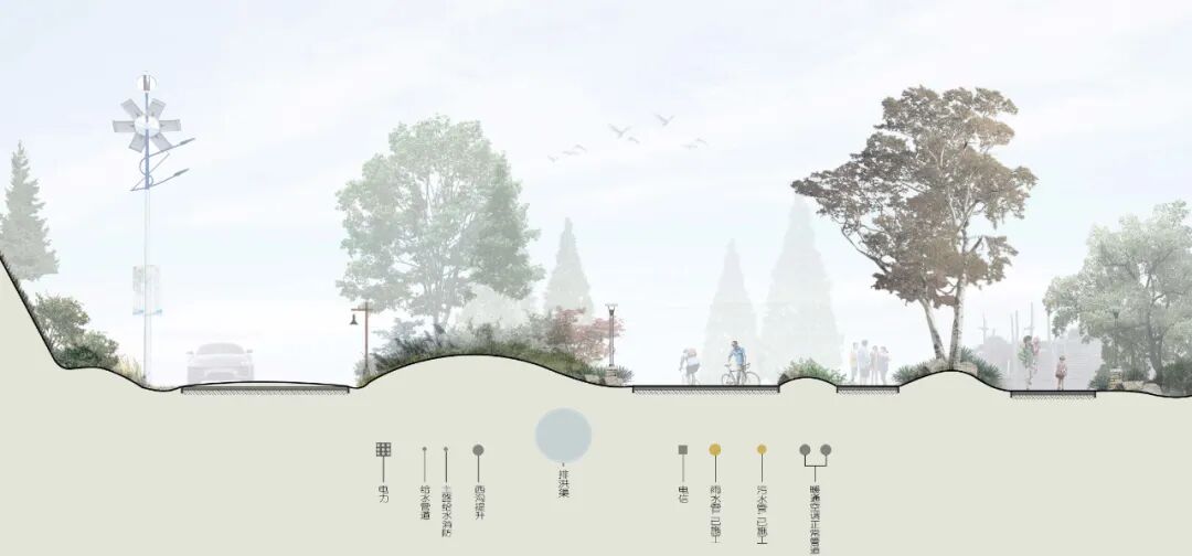 为了更好地把控水位,我们创新地考虑和解决场地纵向与横向的高差变化,并采用了“明暗交替”的手法规划公园内的雨洪排水系统。在地下管线密度低,地上面宽的区段规划流动的开阔水面,而在管线密集的区域转为地下暗渠。地上的水面形成“小型拦水坝”,结合景观元素的水面同时具有美学价值和生态效应,更巧妙的是它降低了水流速度。绿道中的溪流可以储存横截面积10平方米的水,有效地控制住整个排水系统的水量和速率。