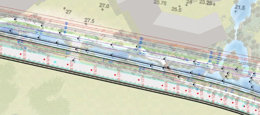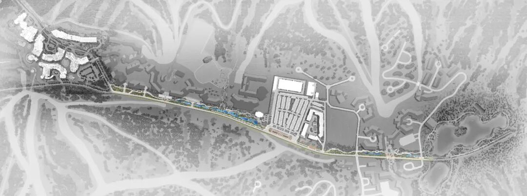 公园所在的张家口崇礼区夜间平均温度-2℃,冻土层达2米厚,因此公园内的所有管线和排洪渠都需尽量处于地面2米以下,以保护管线的正常运转。此外,小镇及绿道公园沿途设施的电力、给排水、暖通设备管线都要从场地内通过,所以场地内管线非常复杂。在规划排洪渠时,要考虑避开地下管线。公园水系的规划首先就是在各种限制条件下开辟出来的“最优解”。