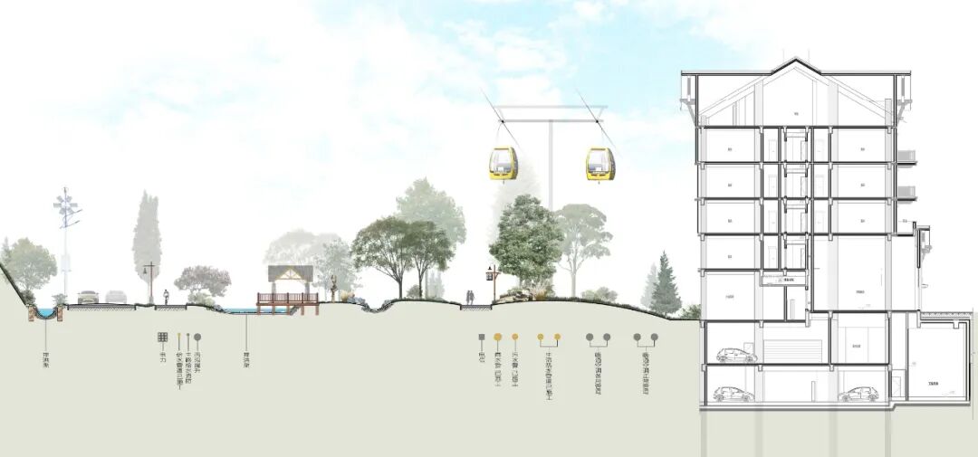整个公园内线性地存在多种交通动线:人行,车行,山地自行车和缆车。我们在车行和山地自行车道之间增加了绿化以保证安全和分流,人行动线上则制造停留点。而缆车动线则在立体空间上考虑,注重它与下层植物的高度关系、以及缆车站与车行动线之间的衔接。通过三维立体的动线组织,让各种通行方式都能安全便捷的共享公园的线性空间。