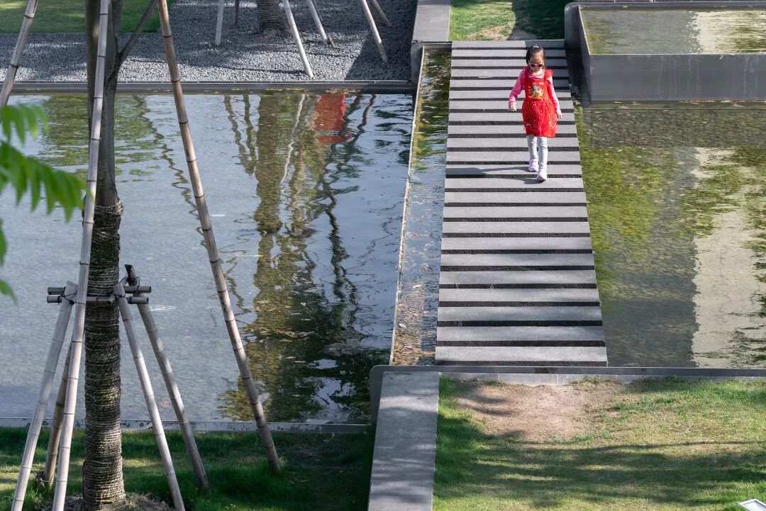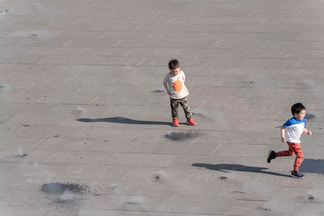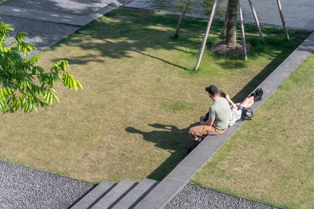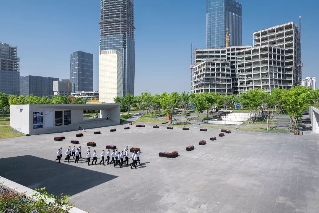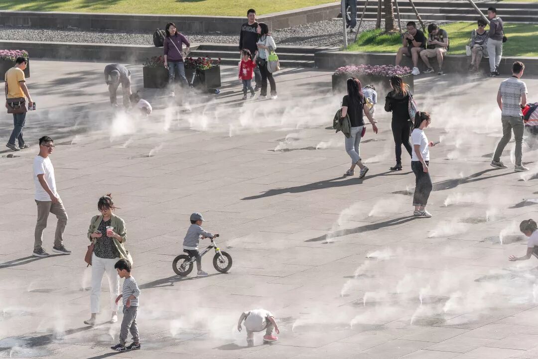 入口广场的区域提供了互动式的雾喷广场及休闲台地空间,容纳了动/静不同的活动人群。针对不同气质的场地状态,我们在拍摄过程中也反复观察不同时段下公共空间所承载的城市生活。