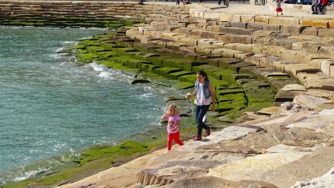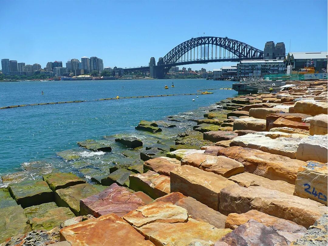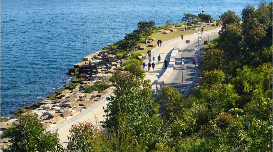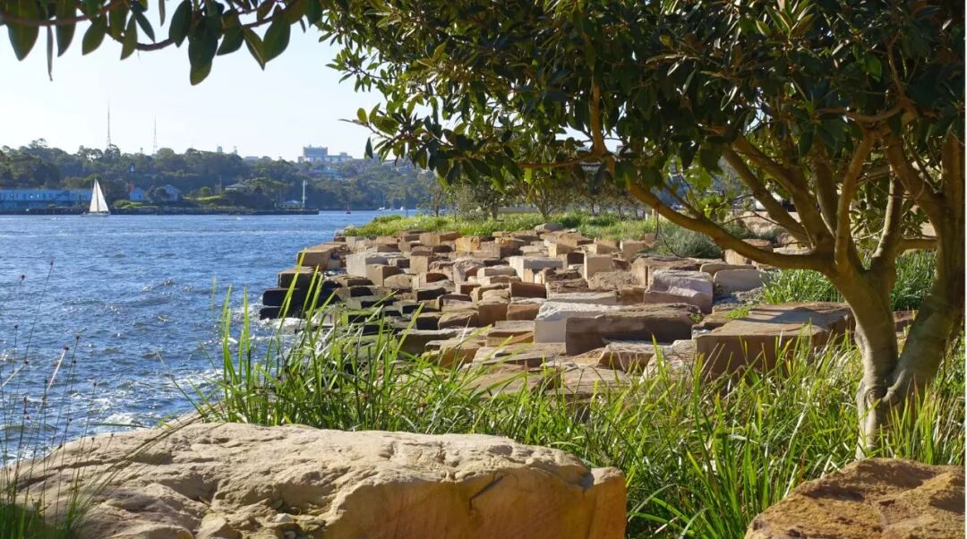 步行道和自行车道沿着岬角蜿蜒,被一个低矮的岩石墙隔开,砂岩墙象征着殖民期前的海岸线。"1836 墙"质朴的堆砌方式让人联想到了悉尼殖民时期的砂岩建筑,这种石材和装饰面在悉尼随处可见。