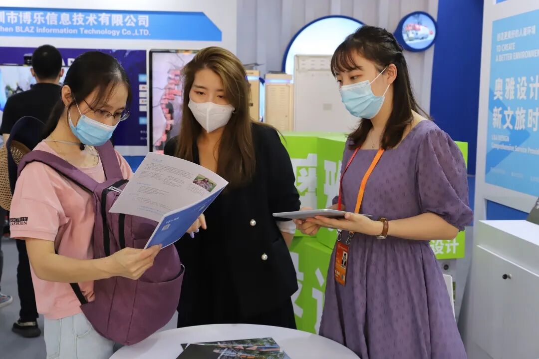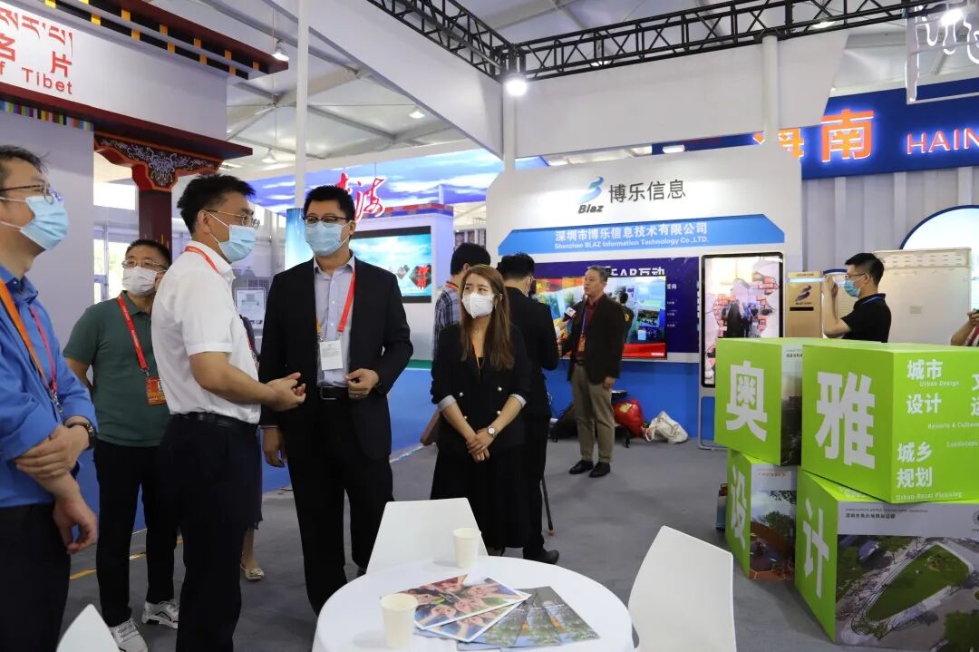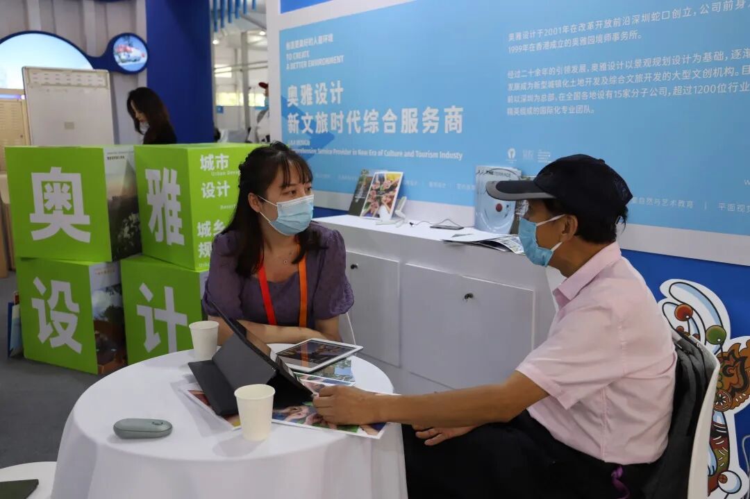 深圳市商务局领导一行莅临奥雅设计展位进行交流了解,奥雅设计北方区域公司市场总监李霁热情接待了商务局领导一行并对公司情况及业务范围进行介绍。