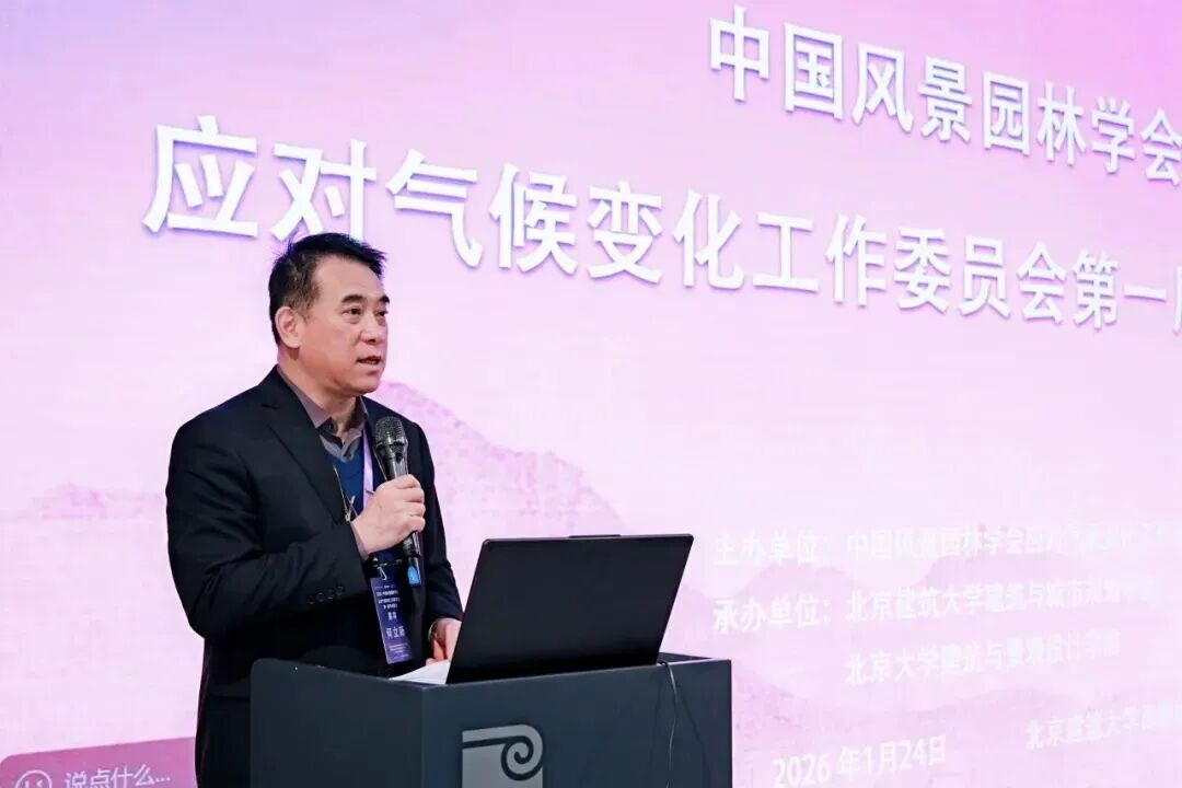 2026年1月24日,由中国风景园林学会应对气候变化工作委员会主办,北京建筑大学建筑与城市规划学院、北京大学建筑与景观设计学院承办的第一届学术会议在北京建筑大学隆重召开。来自全国各地的200余名专家学者、行业代表齐聚一堂,共同探讨风景园林学科在应对气候变化中的重要作用与实践路径。